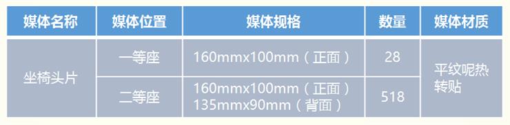高铁广告的强势媒体!位于高铁车厢全部座椅枕头后方,从车头到车尾,矩阵排列,彰显品牌王者气势,一对一近距离、长时间强制覆盖旅客,使品牌影响力深度传播