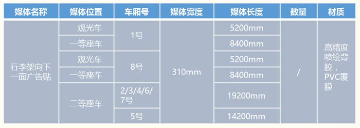 位于所有高铁车厢内行李架下方,对称发布,气势磅礴,视觉冲击力强,无论坐、立、行,都能有绝佳的视觉效果,品牌印象深刻