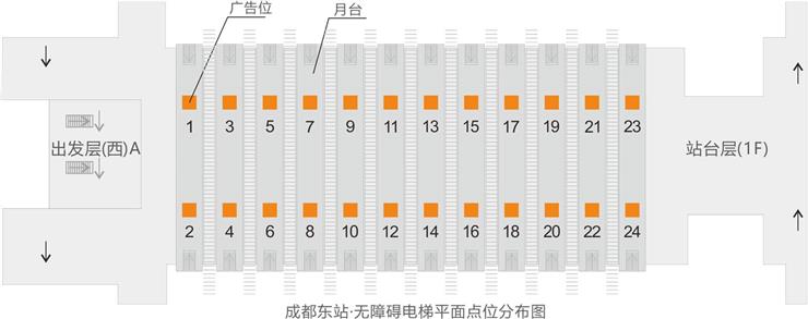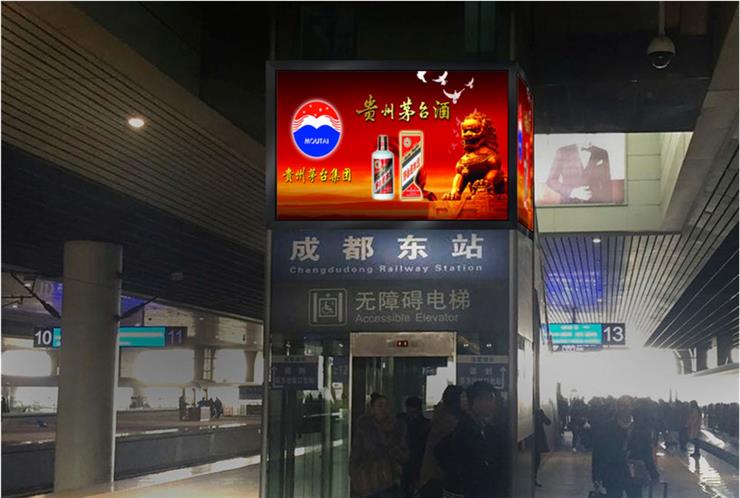 ⊙ 高视效:站台灯箱系列分站台灯箱与无障碍电梯灯箱,站台上多个灯箱并列在狭长的高铁站台上,体现出来的广告效果强烈震撼,具有强劲的视觉冲动;